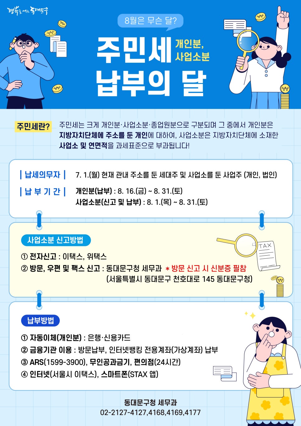 1. 주민세 개인분은 8월 16-31일, 사업소분은 8월 1-31일, 종업원분은 매월 10일까지 납부